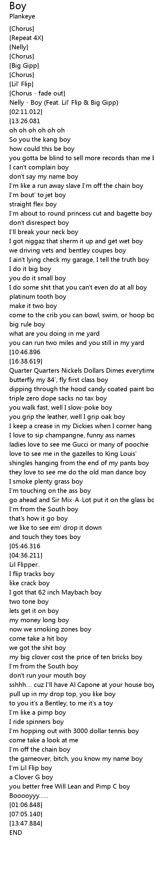 [03:21.050] Nelly - Boy (Feat. Lil' Flip & Big Gipp)