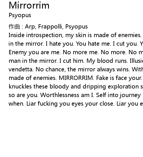 | Inside introspection, my skin is made of enemies. Staring, I despise the image in the mirror. I hate you. You hate me. I cut you. You cut me. You are my enemy. Enemy you are me. No more me. No more. No more me. Inches away from killing the man in the mirror. I cut him. My blood runs. Illusions of walking over this vendetta. No chance, the mirror always wins. Within introspection my skin is made of enemies. MIRRORRIM. Fake is face your. Mirror shattered this to lead knuckles these bloody and dripping exploration self. See just. Pathetic fucking so are you. Worthlessness am I. Self into journey my. Eyes my into look eyes my when. Liar fucking you eyes your close. Liar you eyes your close |