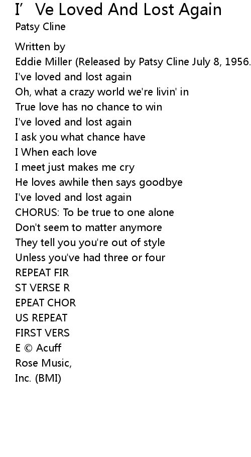 | Song | I’Ve Loved And Lost Again |