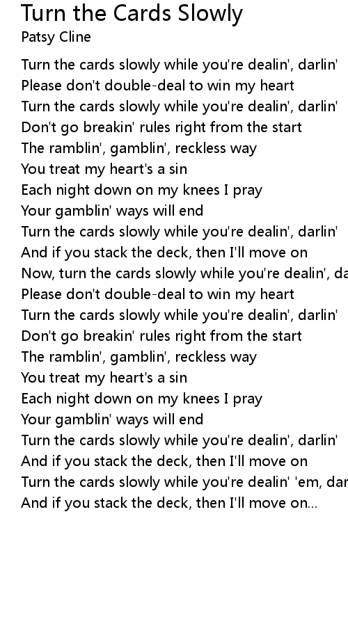Turn the cards slowly while you're dealin' 'em, darlin', |