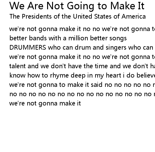 | DRUMMERS who can drum and singers who can sing deep in my heart i do believe we're not gonna make it no no we're not gonna to make it cuz' we don't have the talent and we don't have the time and we don't have the patience and we don't know how to rhyme deep in my heart i do believe we're not gonna make it no no we're not gonna to make it said no no no no no no no no no no no no no no no no no no no no no no no no no no no no no no no no no no no no no no no no no no no we're not gonna make it |