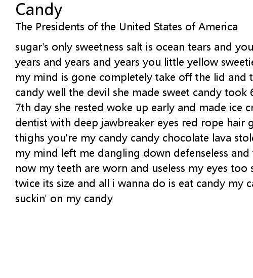 sugar's only sweetness salt is ocean tears and you were my only weakness for years and years and years you little yellow sweetie you were hiding in a jar now my mind is gone completely take off the lid and there you are you're my candy candy well the devil she made sweet candy took 6 days and nights to dream on the 7th day she rested woke up early and made ice cream now the devil she must be a dentist with deep jawbreaker eyes red rope hair gum drop lips cotton candy thighs you're my candy candy chocolate lava stole my body and aftertaste stole my mind left me dangling down defenseless and then sweet candy she said goodbye now my teeth are worn and useless my eyes too sunk to see my tongue swole up to twice its size and all i wanna do is eat candy my candy my candy my candy suckin' on my candy