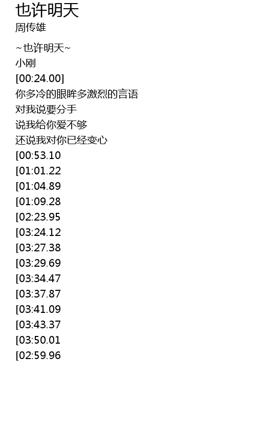| [04:24.20][03:50.01][02:52.00][01:43.73] | wǒ xiǎng nǐ huì shuō may be tomorrow |