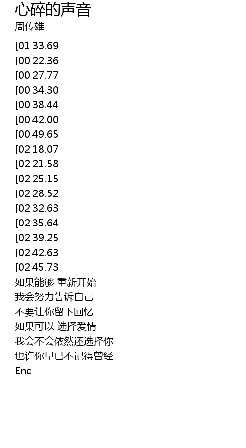 | [03:42.39][02:32.63][01:11.45] | 心碎的声音 |