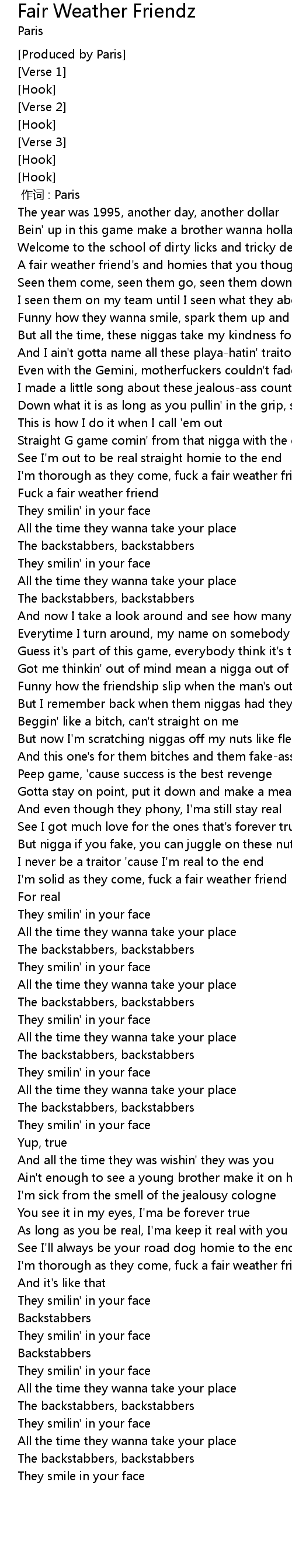 | [01:04.83] | Fuck a fair weather friend |
