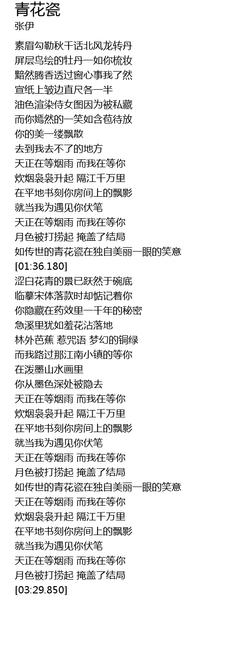 | [01:25.400] | 如传世的青花瓷在独自美丽一眼的笑意 |