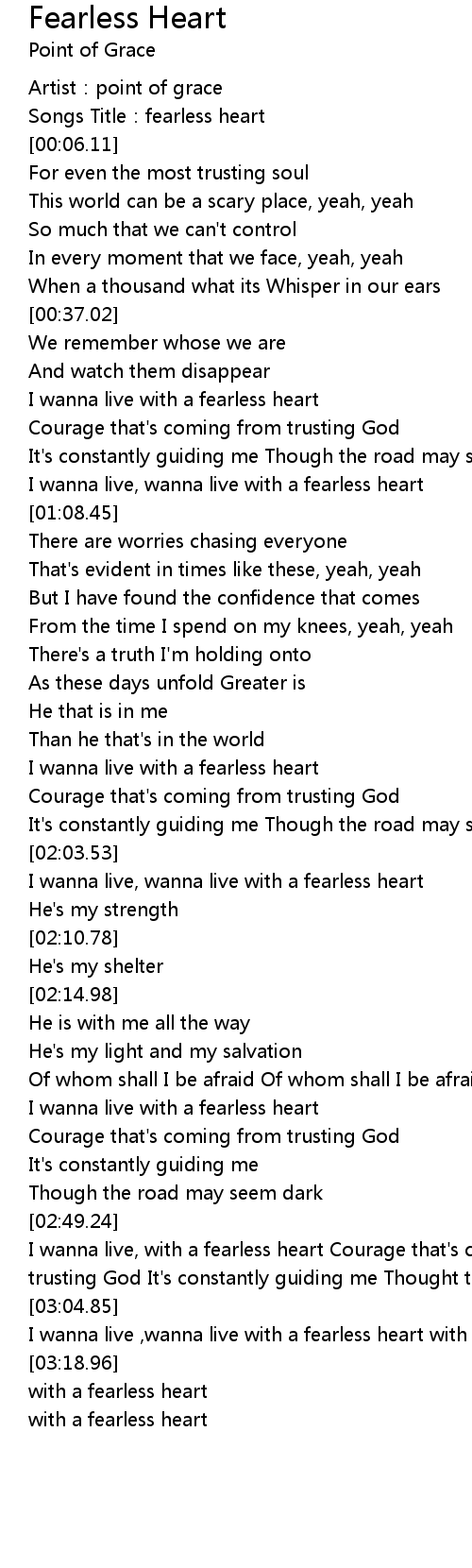 | [02:49.93] | I wanna live, with a fearless heart Courage that' s coming from trusting God It' s constantly guiding me Thought the road may seem dark |