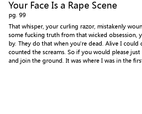 | That whisper, your curling razor, mistakenly wound around my tongue to squeeze some fucking truth from that wicked obsession, your obsession, where I can pass by. They do that when you're dead. Alive I could count the stars, and you counted the screams. So if you would please just hand me my ticket, I will go and join the ground. It was where I was in the first place. |