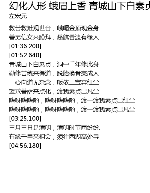 | [03:00.290] | 嗨呀嗨嗨哟,嗨呀嗨嗨哟,渡一渡我素贞出红尘 |