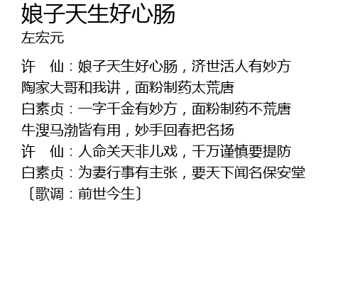 | [00:32.82] | 许 仙:娘子天生好心肠,济世活人有妙方 |
