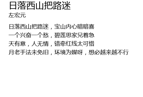 | [00:08.820] | rì luò xī shān bǎ lù mí, bǎo shān nèi xīn àn àn xǐ |