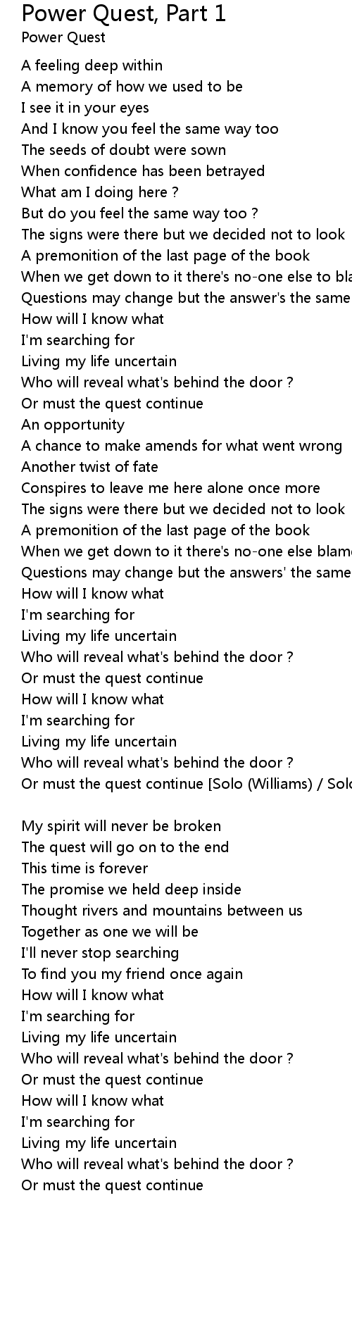 Or must the quest continue [Solo (Williams) / Solo (Bickers) / Solo (Totman) / Solo (Martongelli)] |