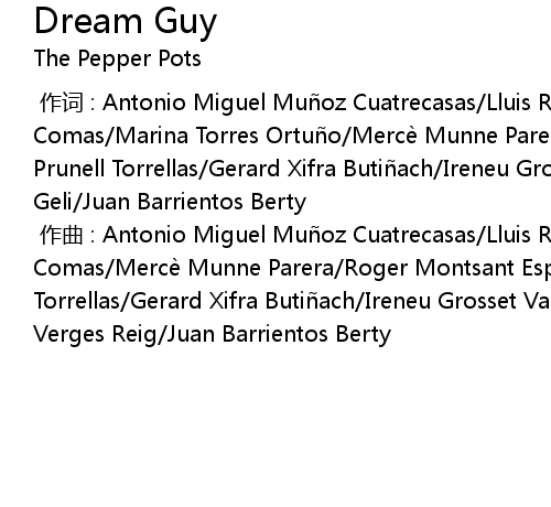 | [00:00.000] | 作曲 : Antonio Miguel Muñoz Cuatrecasas/Lluis Rodriguez Comas/Mercè Munne Parera/Roger Montsant Espigol/Adriana Prunell Torrellas/Gerard Xifra Butiñach/Ireneu Grosset Valles/Isidre Palmada Geli/Joan Verges Reig/Juan Barrientos Berty |