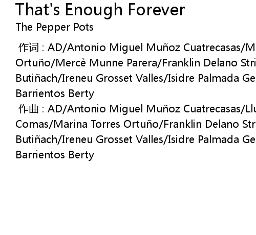 | [00:00.000] | 作词 : AD/Antonio Miguel Muñoz Cuatrecasas/Marina Torres Ortuño/Mercè Munne Parera/Franklin Delano Stribling/Gerard Xifra Butiñach/Ireneu Grosset Valles/Isidre Palmada Geli/Joan Verges Reig/Juan Barrientos Berty |