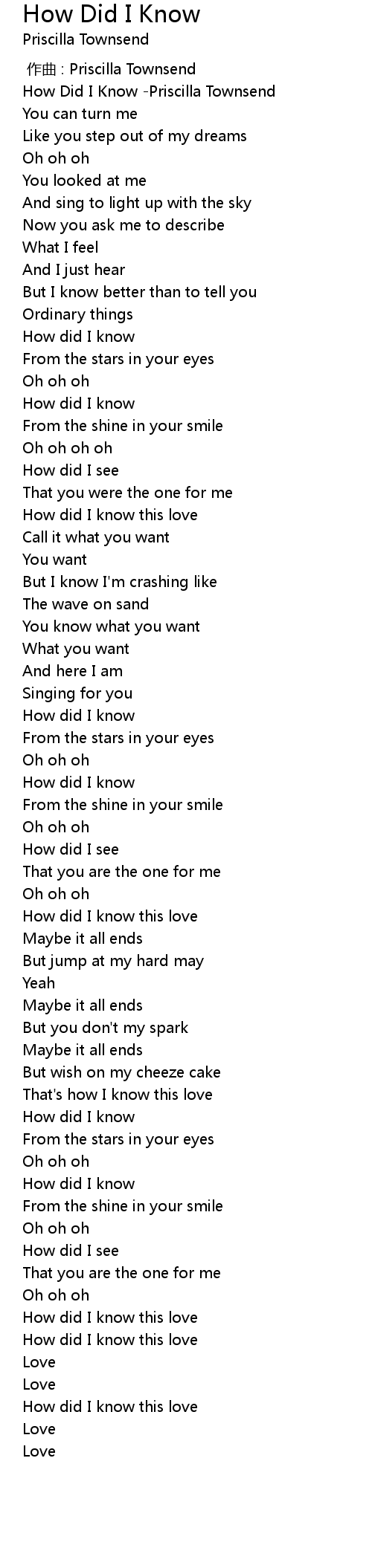 | [00:00.469] | How Did I Know -Priscilla Townsend |