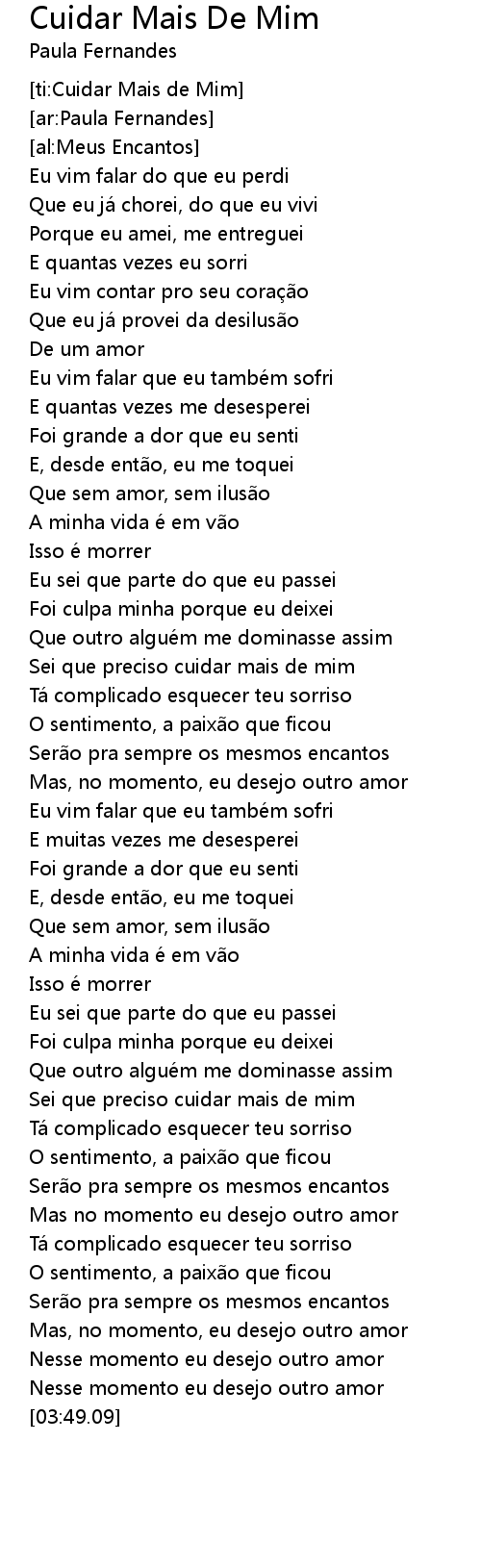 | [02:38.54] | Sei que preciso cuidar mais de mim |