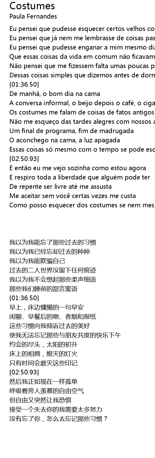 | [03:32.27] | Como posso esquecer dos costumes se nem mesmo esqueci de você? |