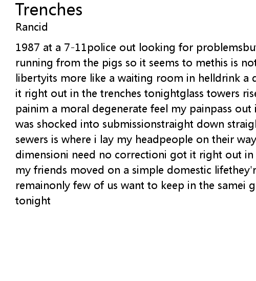 1987 at a 7-11police out looking for problemsbut im no average hoodlumstill running from the pigs so it seems to methis is not the land of love and libertyits more like a waiting room in helldrink a qwart and watch me dwelli got it right out in the trenches tonightglass towers rise above the filth and the painim a moral degenerate feel my painpass out in a squat on missionthat night i was shocked into submissionstraight down straight down to hell i headsystems of sewers is where i lay my headpeople on their way are like on a different dimensioni need no correctioni got it right out in the trenches tonightsome of my friends moved on a simple domestic lifethey're all gone only a few of us remainonly few of us want to keep in the samei got it right out in the trenches tonight |