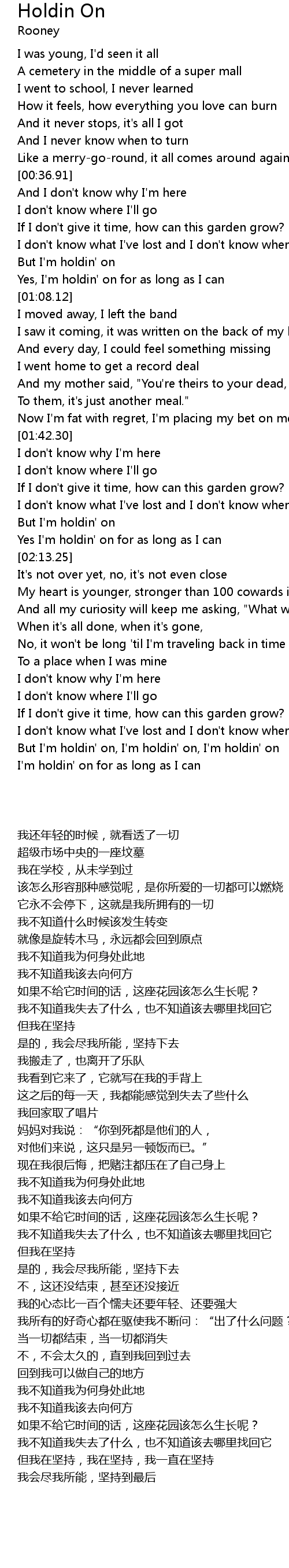 | [03:20.65] | But I'm holdin' on, I'm holdin' on, I'm holdin' on |