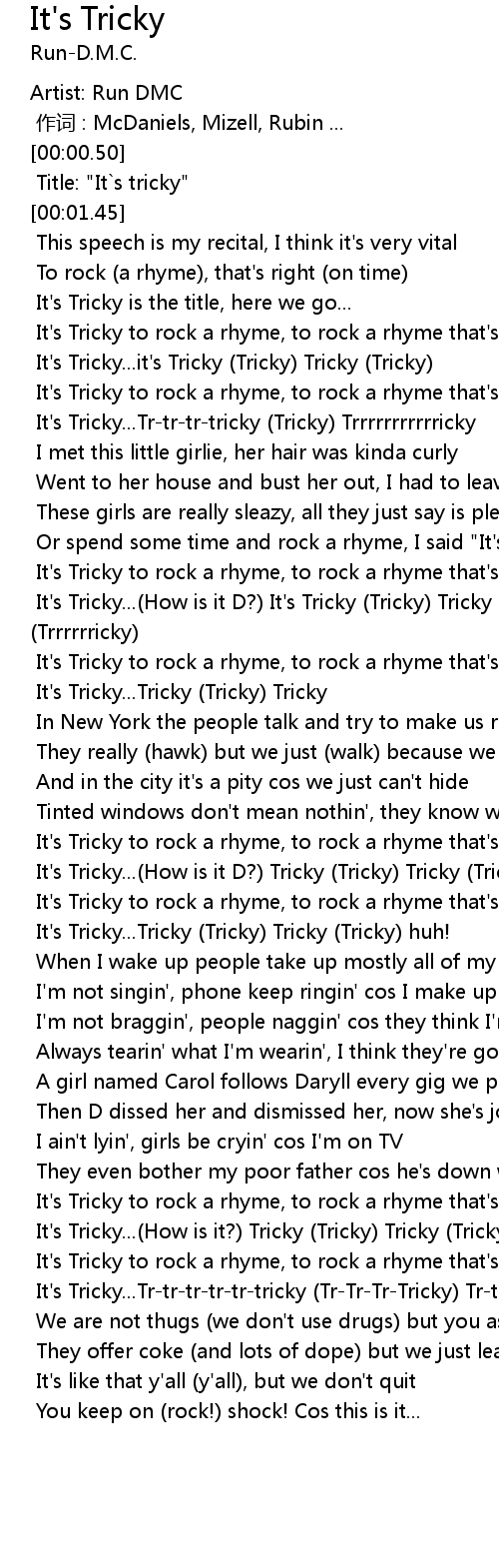 | [02:20.63] | It's Tricky...Tr-tr-tr-tr-tr-tricky (Tr-Tr-Tr-Tricky) Tr-tr-tr... |