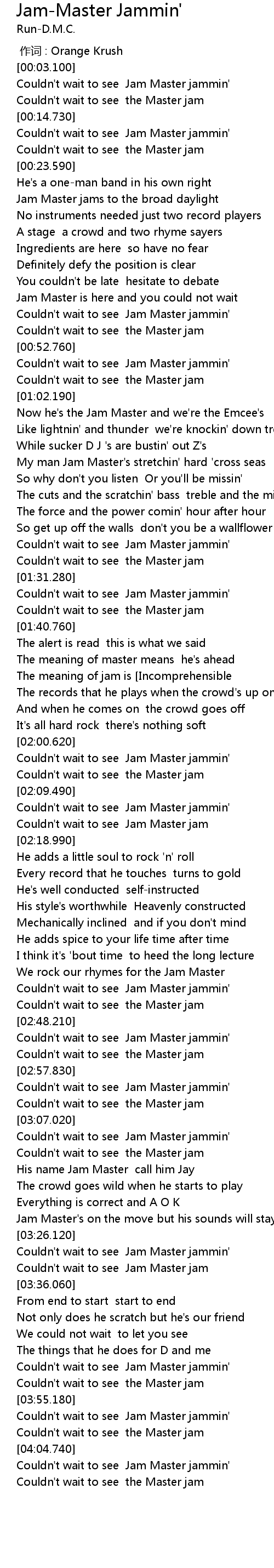 | [03:02.450] | Couldn' t wait to see Jam Master jammin' |