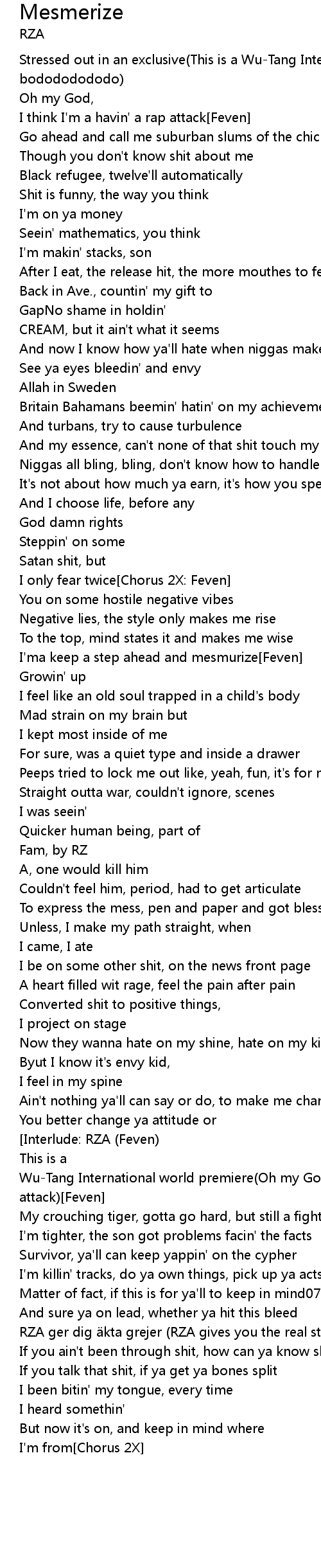 | I' mma get this bitch, son Chorus 2X Interlude: RZA Feven | |
