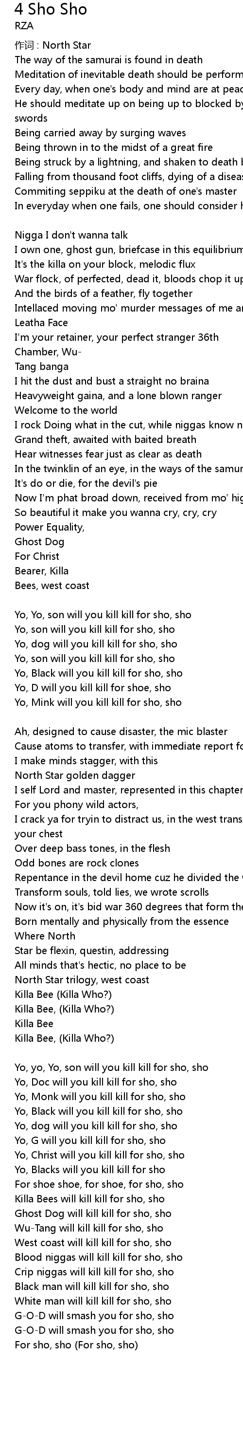 | Yo, Christ will you kill kill for sho, sho Minky, RZA | |