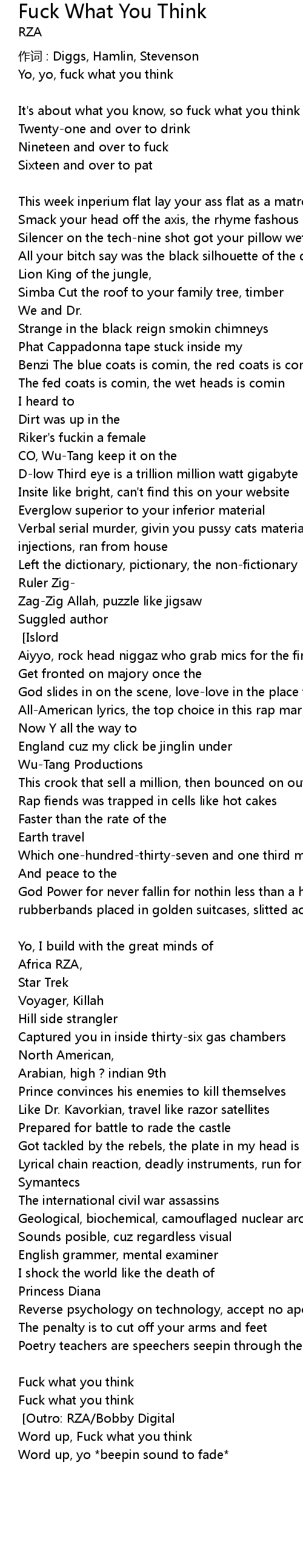 | Fuck what you think [Chorus: RZA/Bobby Digital] | |