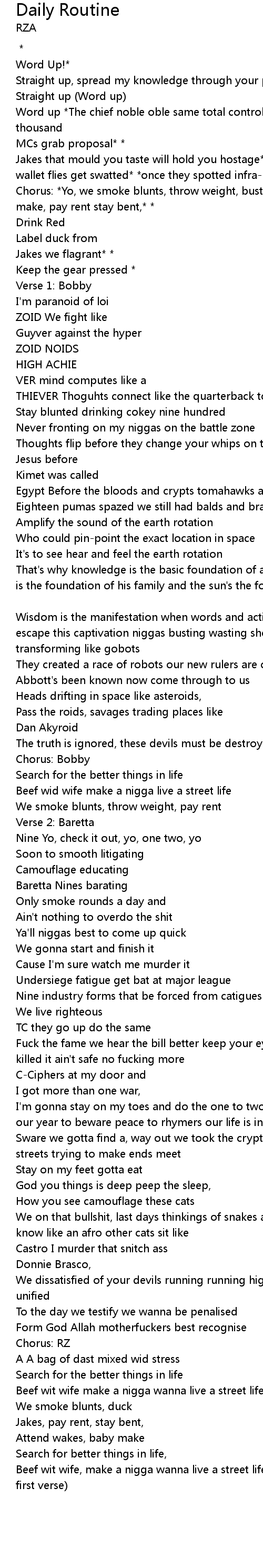 Chorus: *Yo, we smoke blunts, throw weight, bust shots,* *attend wakes baby make, pay rent stay bent,* * |