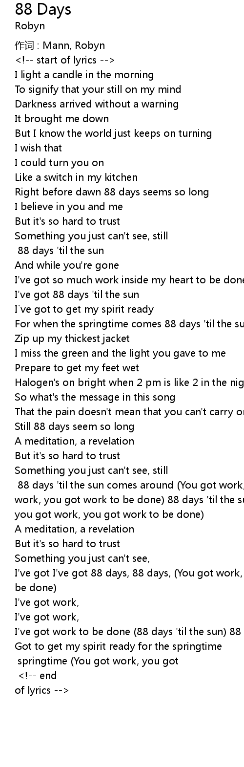 | Still I' ve got 88 days ' til the sun scat springtime You got work, you got work, you got work to be done 88 days ' til the springtime fade out ! end of lyrics |