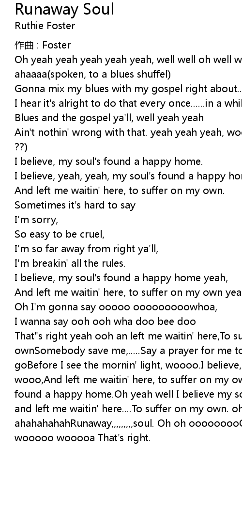 | That" s right yeah ooh an left me waitin' here, To suffer on my own, ooh my ownSomebody save me,..... Say a prayer for me tonight. I' ve got a long way to goBefore I see the mornin' light, woooo. I believe, my soul' s found a happy home, wooo, And left me waitin' here, to suffer on my own, Yeah... oh I believe, my soul' s found a happy home. Oh yeah well I believe my soul' s found a happy home. Yeah oooh and left me waitin' here.... To suffer on my own. ohooooaRunaway ahahahahahRunaway,,,,,,,,, soul. Oh oh ooooooooOh yeah yeah. awoooooaOh yeah yeah wooooo wooooa That' s right. |