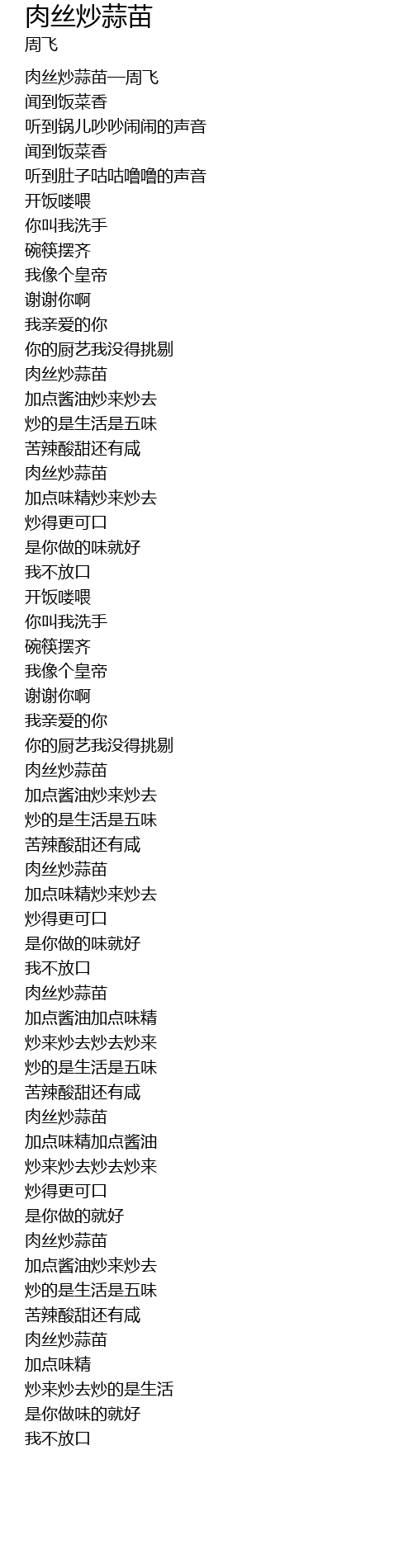 | [00:03.72] | 肉丝炒蒜苗—周飞 |