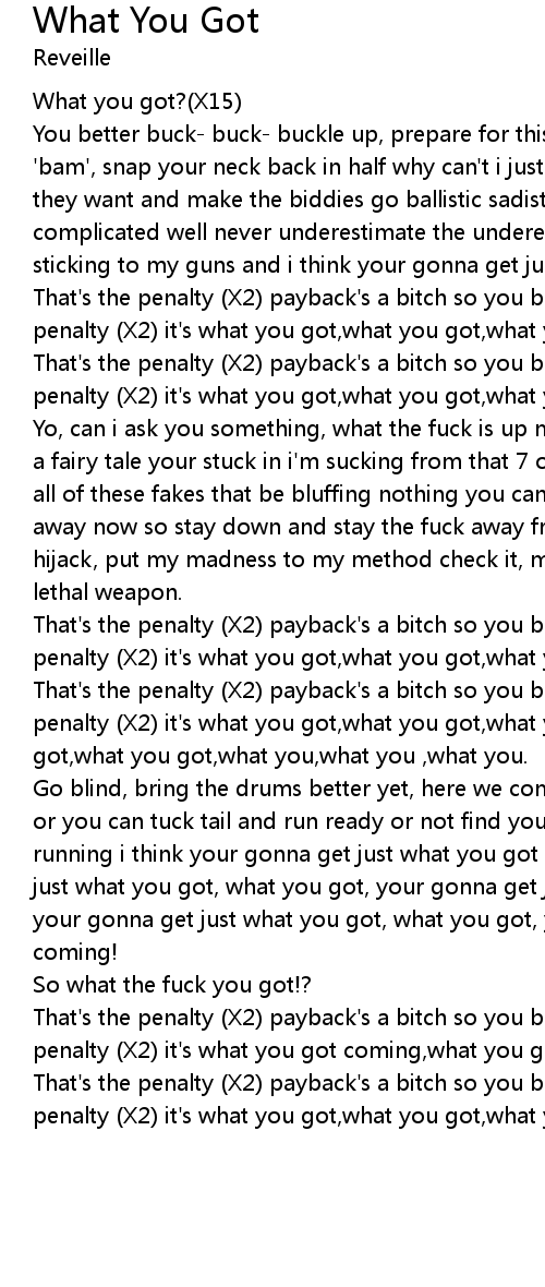 That's the penalty (X2) payback's a bitch so you best keep running that's the penalty (X2) it's what you got,what you got,what you got coming, what you got,what you got,what you,what you ,what you. |