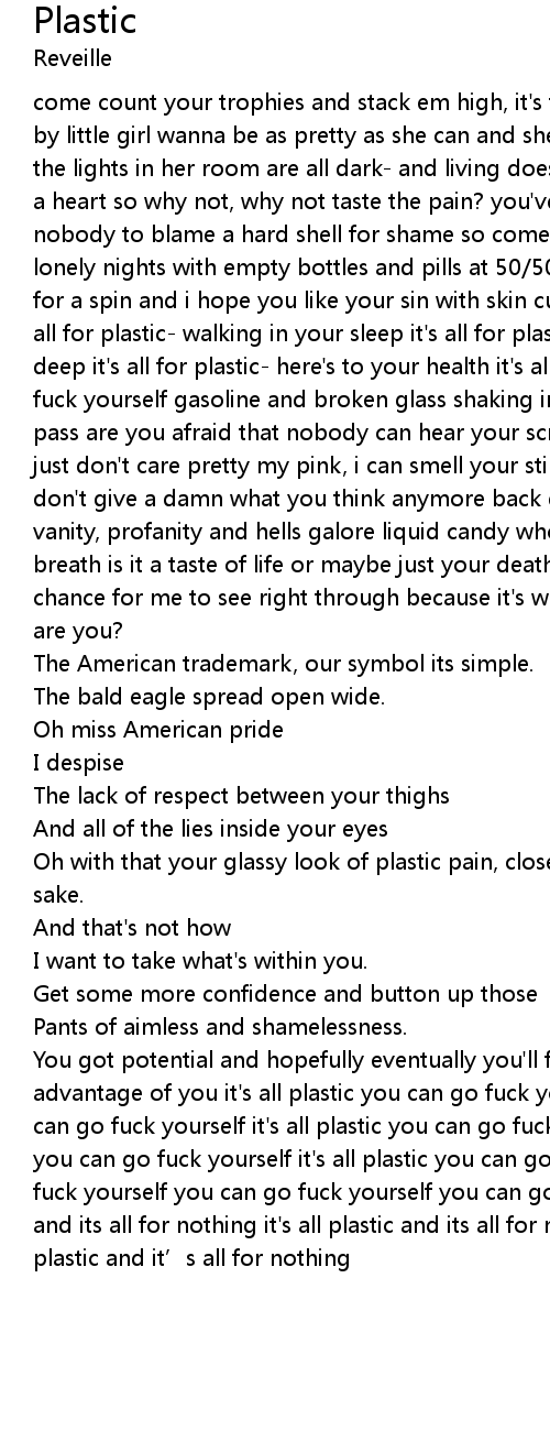 | come count your trophies and stack em high, it' s funny how reality can pass you by little girl wanna be as pretty as she can and she lives by whatever it takes the lights in her room are all dark and living doesn' t hurt if you haven' t got a heart so why not, why not taste the pain? you' ve got nothing to lose and nobody to blame a hard shell for shame so come display your skillz, cuz fuck lonely nights with empty bottles and pills at 50 50 fills per shot cum take her for a spin and i hope you like your sin with skin cuz you can count me out it' s all for plastic walking in your sleep it' s all for plastic and it' s only skin deep it' s all for plastic here' s to your health it' s all plastic so you can go fuck yourself gasoline and broken glass shaking in your coffin as the hearses pass are you afraid that nobody can hear your screams? cuz we' re out here, we just don' t care pretty my pink, i can smell your stink makes me sick and i don' t give a damn what you think anymore back down against the floor all for vanity, profanity and hells galore liquid candy whore suck it up, hold your breath is it a taste of life or maybe just your death? or better yet another chance for me to see right through because it' s who you fuck but who the fuck are you? | |