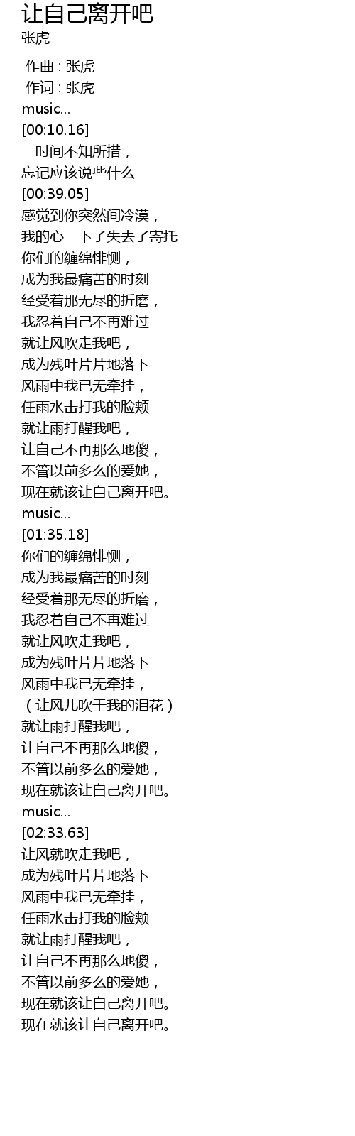| [03:32.23] | xiàn zài jiù gāi ràng zì jǐ lí kāi ba. |