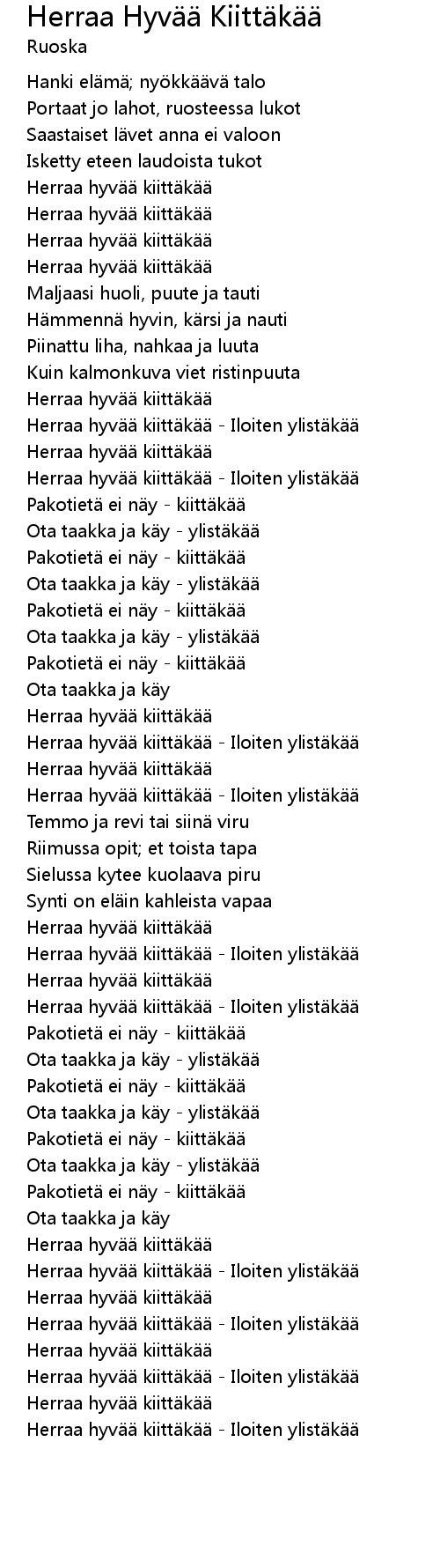 | [01:49.21] | Herraa hyv kiitt k Iloiten ylist k |