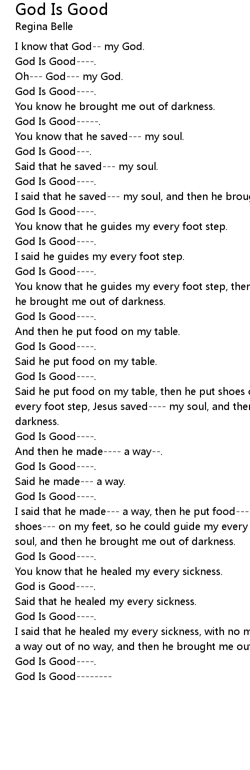 Said he put food on my table, then he put shoes on my feet, so he could guide my every foot step, Jesus saved---- my soul, and then he brought me out of darkness. |