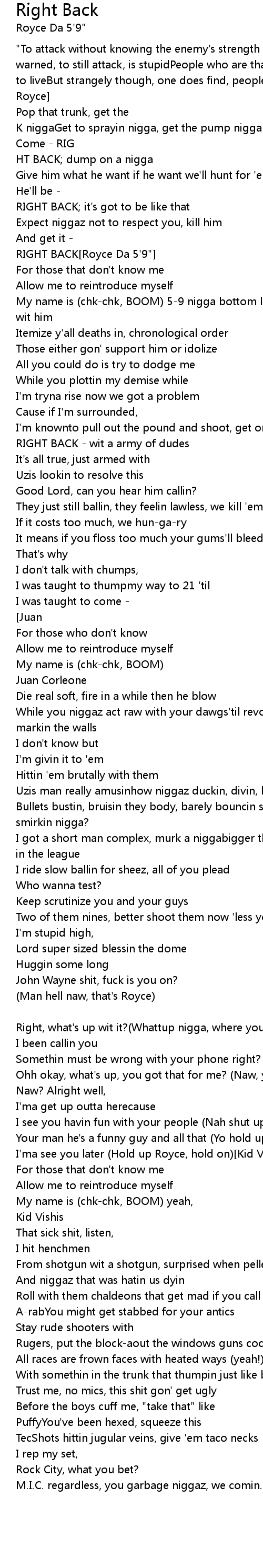 "To attack without knowing the enemy's strength is foolishAnd after being warned, to still attack, is stupidPeople who are that stupid just don't deserve to liveBut strangely though, one does find, people who are that stupid."[Chorus: Royce] |