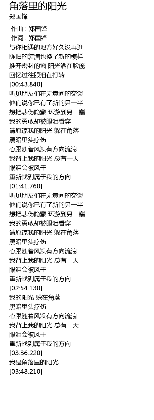 | [03:37.790] | wǒ shì jiǎo luò lǐ de yáng guāng |