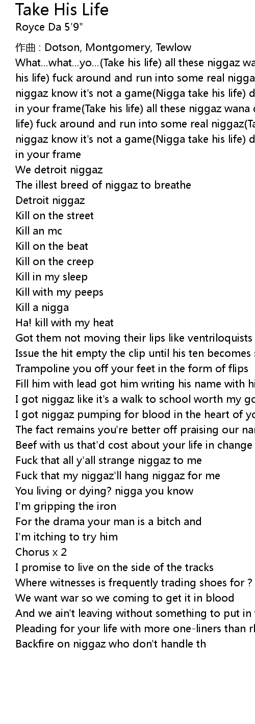 | What... what... yo... Take his life all these niggaz wana do is talk Nigga take his life fuck around and run into some real niggaz Take his life don' t these niggaz know it' s not a game Nigga take his life don' t make me put this bullet in your frame Take his life all these niggaz wana do is talk Nigga take his life fuck around and run into some real niggaz Take his life don' t these niggaz know it' s not a game Nigga take his life don' t make me put this bullet in your frame | |