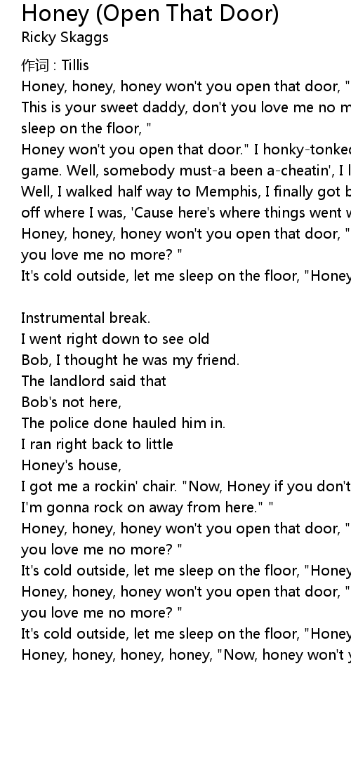 | Honey, honey, honey, honey, " Now, honey won' t you open that door. |