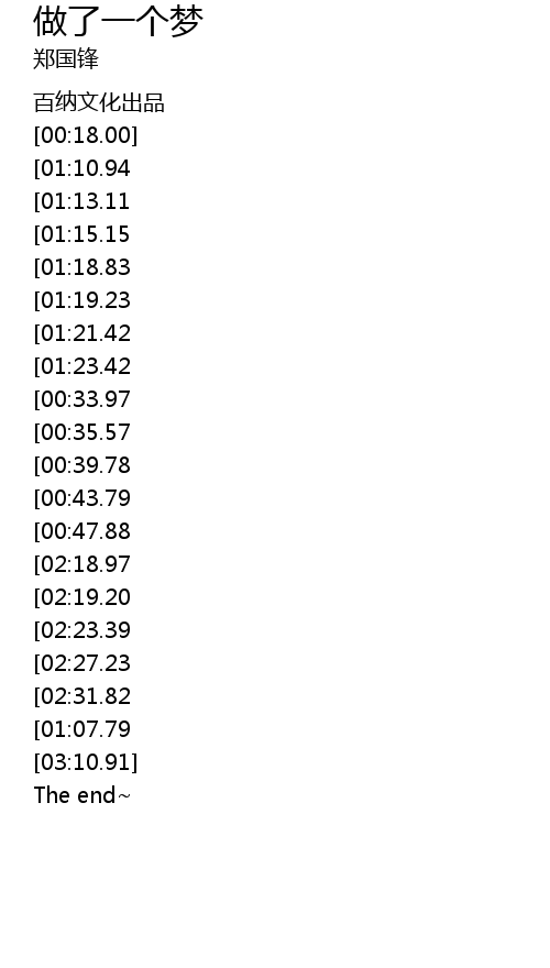 | [02:55.27][01:10.94][00:18.86] | 昨晚上做了一个梦 |