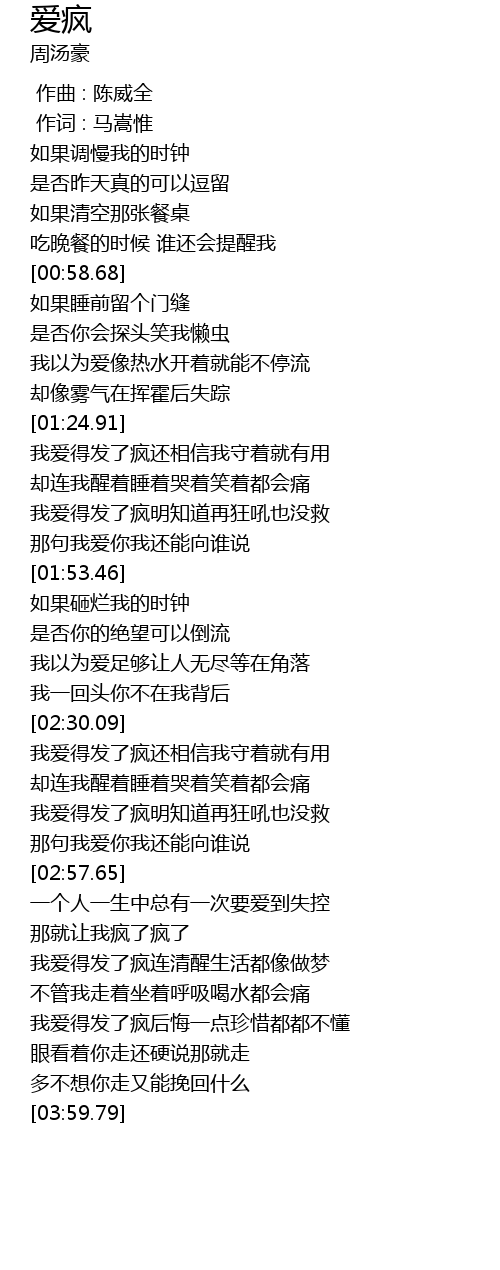| [01:38.99] | 我爱得发了疯明知道再狂吼也没救 |