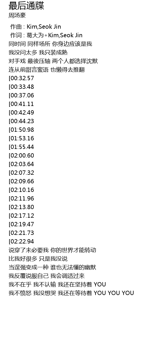 | [00:01.00] | zuo ci : ge da wei Kim, Seok Jin |