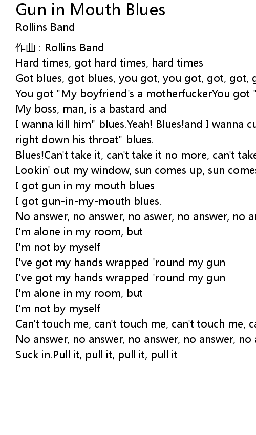 | I wanna kill him" blues.Yeah! Blues!and I wanna cut his balls off and shove 'em right down his throat" blues. | |
