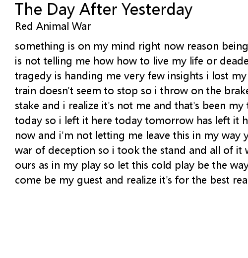 something is on my mind right now reason being reason pending is that our past is not telling me how how to live my life or deaden my life my story your tragedy is handing me very few insights i lost my train of thought and that train doesn't seem to stop so i throw on the brakes breaks like your life is at stake and i realize it's not me and that's been my tragedy so i'll leave it here today so i left it here today tomorrow has left it here today right here right now and i'm not letting me leave this in my way you can't negotiate this age old war of deception so i took the stand and all of it we've gone our seperate ways ours as in my play so let this cold play be the way that i have seen and please come be my guest and realize it's for the best realize it's for the rest |