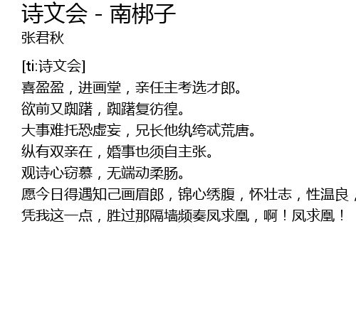 | [00:42.974] | 喜盈盈,进画堂,亲任主考选才郎。 |