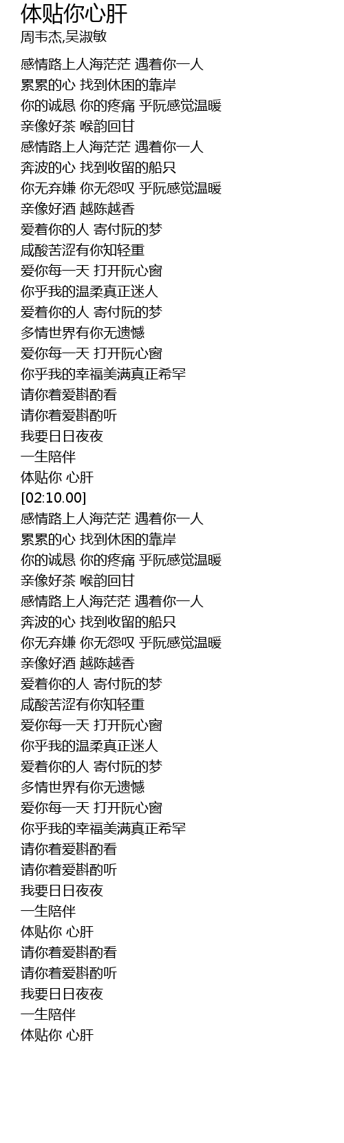 | [02:02.38] | tǐ tiē nǐ xīn gān |