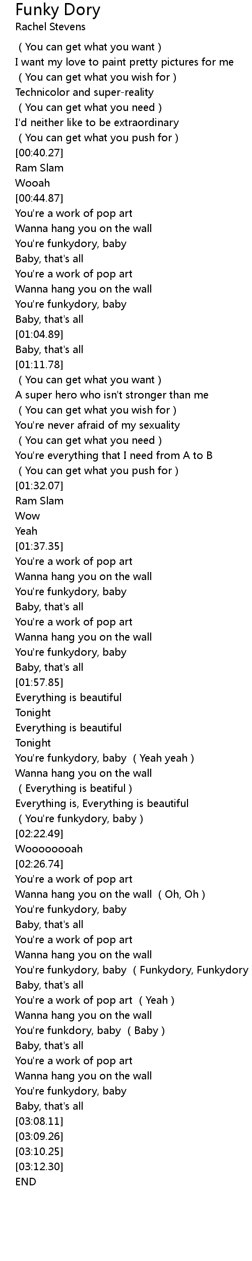 | [02:42.14] | You' re funkydory, baby Funkydory, Funkydory |
