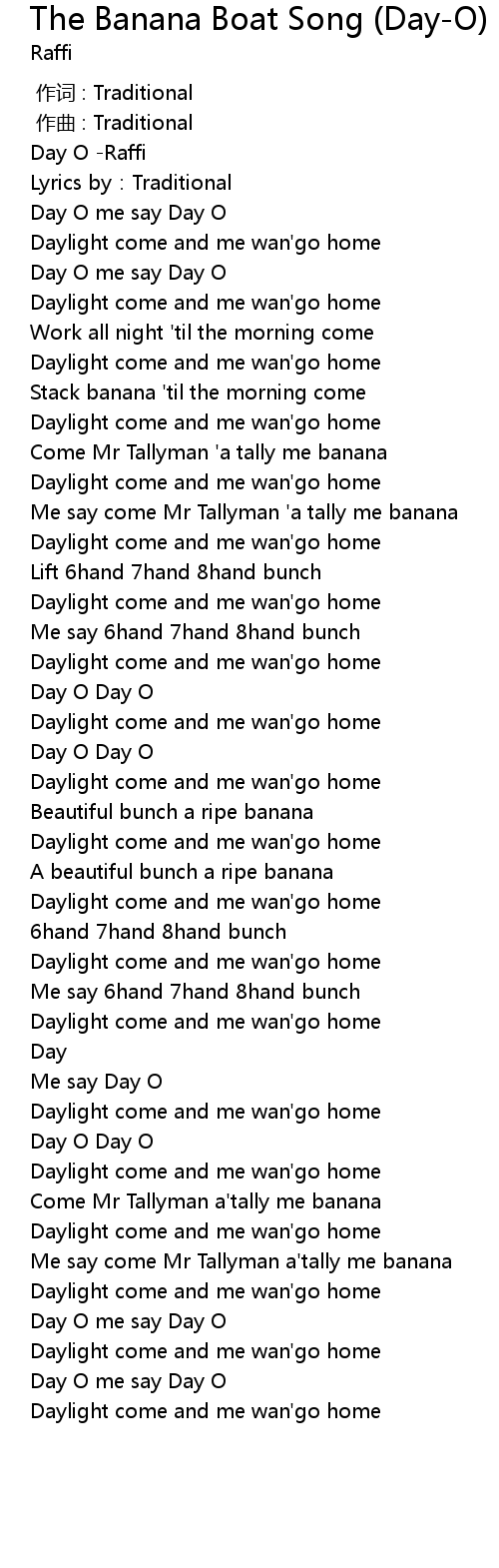 | [00:40.896] | Come Mr Tallyman 'a tally me banana |